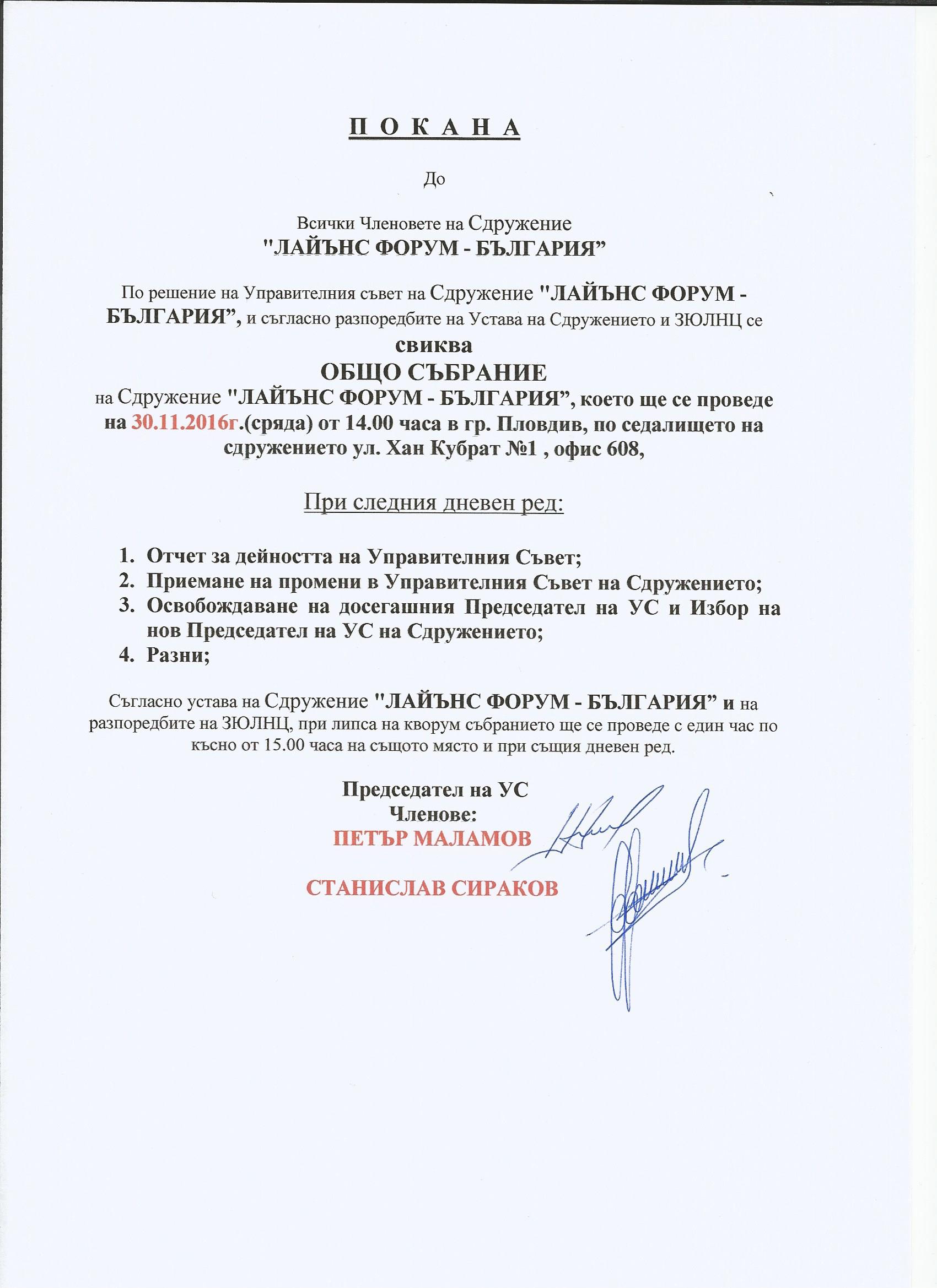 - Покана за ОС на Сдружение ЛАЙЪНС ФОРУМ БЪЛГАРИЯ (30.11.2016 г.)